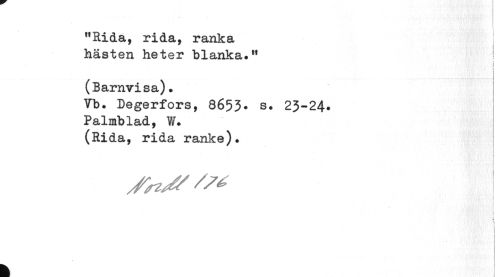 //// - . ... //// "Rida, rida, ranka hästen heter blanka." //// i i //// i //// (Barnvisa) • //// Vb. Degerfors, 8653. s. 23-24. Palmblad, W. (Rida, rida ranke). //// /h/f* 1 //// ' i //// i //// i > //// -1 //// k ////