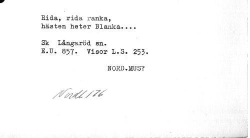 //// Rida, rida ranka, j //// hästen heter Blanka... //// Sk Långaröd sn. //// E.U. 857. Visor L.S. 255. //// NORD.MUS? //// I ////