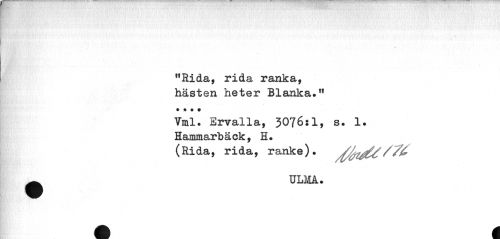 //// "Rida, rida ranka, //// hästen heter Blanka»11 • • • • //// Vml. Ervalla, 3076:1, s. 1. Hammarb ä ck, H. (Rida, rida, ranke). //// ^ ULMÅ. ////