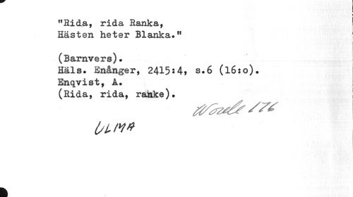//// i //// "Rida, rida Ranka, //// Hästen heter Blanka." ; //// (Barnvers). //// Häls. finånger, 2415:4, s.6 (l6:o). Enqvist, A. //// (Rida, rida, rahke). I //// O i- M* //// t ////
