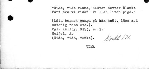 //// "Rida, rida ranka, hästen hetter Blanka //// 4 //// Vart ska vi rida? Till en liten piga.11 //// ^^ (Låta barnet gunga på kxx knät, läsa med //// entonig röst etc.). //// Vgl. Källby, 9353, s. 2. Meijel, A. //// (Rida, rida, ranke). wjfyte' / //// ULM ////
