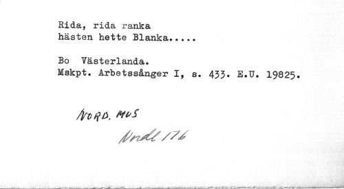 //// Rida, rida ranka hästen hette Blanka... //// Bo Västerlanda. //// Mskpt• Arbetssånger I, s. 433* E.U. 19825. //// /htA ////