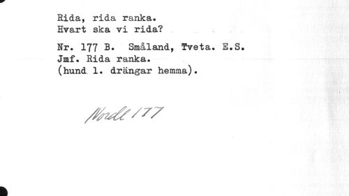 //// Rida, rida ranka. //// Hvart ska vi rida? ... //// Nr. 177 B. Småland, Tveta. E.S. //// Jmf. Rida ranka. //// (hund 1. drängar hemma). //// \ ////