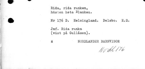 //// Rida, rida ranken, hästen heta Blänken. //// •f Nr 176 D. Helsingland. Delsbo. E.S. //// Jmf. Rida ranka (väst på Gullåsen). //// is NORDLANDER BARNVISOR //// zl/ri/S/K ////