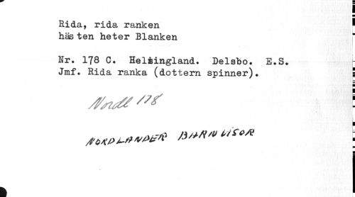 //// I //// ¦ //// Rida, rida ranken - //// ¦ //// häs ten heter Blänken //// ... • • - ... -•• I //// Nr. 178 C. Helsingland. Delabo. E.S. r //// Jmf. Rida ranka (dottern spinner). 1 //// i //// I //// U //// I ////