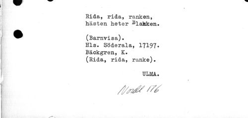 //// r //// Rida, rida, ranken, hästen heter ^lahken. //// f //// a //// M wk. m //// ^^ (Barnvisa). //// Hls. Söderala, 17197• //// Bäckgren, K. (Rida, rida, ranke). //// ULMA. //// i //// /u //// i //// k ////
