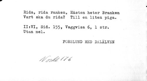 //// ¦ //// Rida, rida ranken, Hästen heter Branken Vart ska du rida? Till en liten piga. //// j //// II:VI, Sid. 155, Vaggvisa 6, 1 str. Utan mel. //// FORSLUND MED DALÄLVEN //// | //// P //// > //// ; ¦ ////