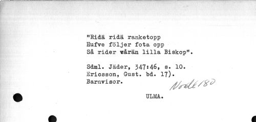 //// "Ridä ridä ranketopp //// Hufve följer fota opp //// Så rider vårän lilla Biskop". //// Sdml. Jäder, 347:46, s. 10. Ericsson, Gust. bd. 17)* //// Barnvi sor. /f/fdé/2^ //// ^ ULMÅ. //// 1 ////