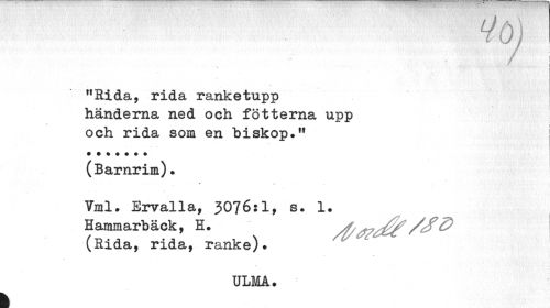 //// VOy //// "Rida, rida ranketupp //// i i //// händerna ned och fötterna upp och rida som en biskop.11 //// (Barnrim). //// i //// Vml. Ervalla, 3076:1,'s. 1. H amm arb ä ck, H • a , , ^ /J*D //// (Rida, rida, ranke). //// ULMA. //// i ////