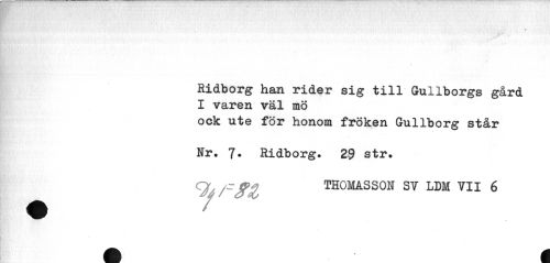 //// Mk" vi //// Ridborg han rider sig till Gullborgs gård I våren väl mö //// ock ute för honom fröken Gullborg står Nr. 7. Ridborg. 29 str. //// ^^rtfZ THOMASSON SV LDM VII 6 //// m å ////