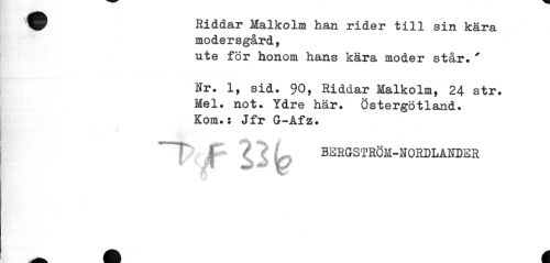 //// Hiddar Malkolm han rider till sin kära modersgård, //// ute för honom hans kära moder står.' //// Nr. 1, sid. 90, Riddar Malkolm, 24 str. Mel. not. Ydre här. Östergötland. Kom.: Jfr G-Afz. //// . Jp ^jjU BERGSTRÖM-NORDLANDER A å ////