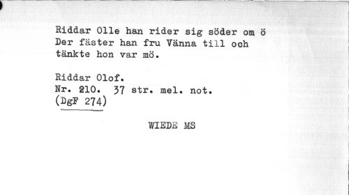 //// / i //// I //// Hiddar Olle han rider sig söder om ö Der fäster han fru Vänna till och tänkte hon var mö. //// jj > //// Riddar Olof. | //// i //// Nr. tio. 37 str. mel. not. //// (DgF 274) //// WIEDE MS //// (' ; //// I //// I ////