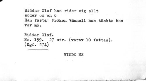 //// Riddar Olof han rider sig allt söder om en ö //// Han fästa • Fröken Vänneli han tänkte hon var mö. //// Riddar Olof. //// Nr. 159* 27 str. (varav 10 fattas). //// (Dgf. 274) //// WIEDE MS //// ... ... » ////