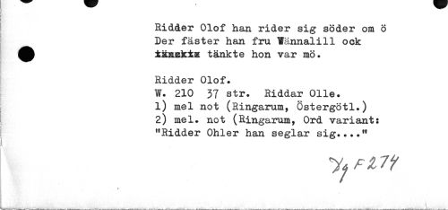 //// Ridder Olof han rider sig söder om ö Der fäster han fru Wännalill ock ^^ ±äRBk±x tänkte hon var mö* //// Ridder Olof* //// W* 210 37 str. Riddar Olle* //// 1) mel not (Ringarum, Östergötl.) //// 2) mel. not (Ringarum, Ord variant: "Ridder Ohler han seglar sig.*..11 //// * ////