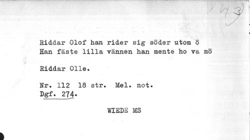 //// ' rf //// . //// . ... . ... • • .' • . i //// •... ... : • " ' • [ //// Riddar Olof han rider sig söder utom ö I //// Han fäste lilla vännen han mente ho va mö //// jpf //// Riddar Olle. //// Nr. 112 18 str. Mel. not. Dgf. 274. //// WIEDE MS //// I ////