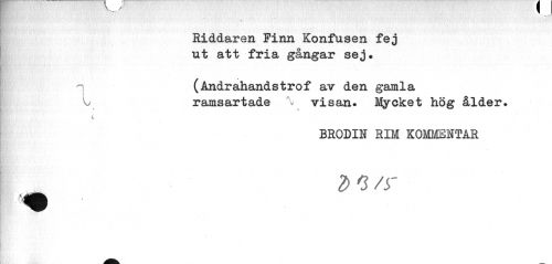 //// Riddaren Finn Konfusen fej ut att fria gångar sej. //// (Andrahandstrof av den gamla ramsartade % visan. Mycket hög ålder. //// L //// BRODIN RIM KOMMENTAR //// 2> 3 /sr ////