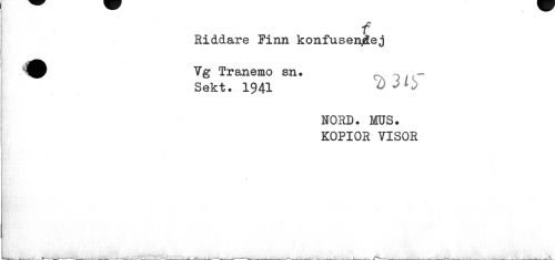 //// f //// Riddare Finn konfusen/äej //// Vg Tranemo sn. - - //// Sekt. 1941 //// NORD. MUS. KOPIOR VISOR //// I ////