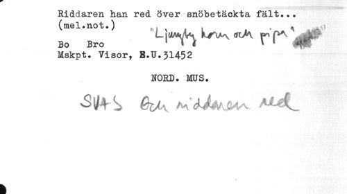 //// Riddaren han red över snöbetäekta fält... (mel.not.) , ^ v //// L | om/W wV\ f* ^åa? //// Bo Bro 1 » « » 1 ••4W //// Mskpt. Visor, B.U.31452 //// NORD. MUS. //// k ////