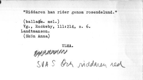 //// "Riddaren han rider genom rosendelund." (balla#m. mel.) //// Vg., Rackeby, 111:214* s. 6. //// Landtmanson. (Skön Anna) //// ULM. I //// l //// S J A $ öiA jiÅddA/dUx A&A^ //// t //// i //// i ////