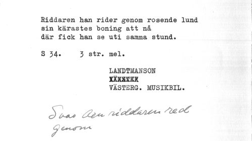 //// Riddaren han rider genom rosende lund //// sin kärastes boning att nå //// där fick han se uti samma stund. //// S 34* 3 str. mel. //// > //// LANDTMANSON //// JXSSSSK //// VÄSTERG. MUSIKBIL. //// i e ////