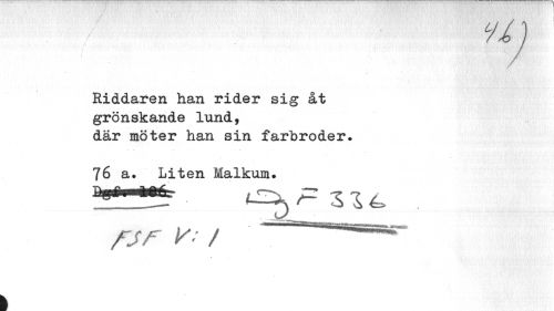 //// il) //// r //// Riddaren han rider sig åt //// grönskande lund, //// där möter han sin farbroder. //// 76 a. Liten Malkum. //// /jr y- / * ~ " //// i ////