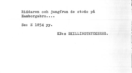 //// ' I //// I //// I //// Riddaren och jungfrun de stodo på Hamborgabro.•.• //// Se: E 1854 yy* ; //// j //// KB:s SKILLINGTBYCKSHEG. //// i //// i- //// i ¦ ////