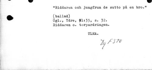 //// "Riddaren och jungfrun de sutto på en bro." ä^ (ballad) //// ^ Ögl., Ydre, 91:33, s. 32. //// Riddaren o. torpardrängen. //// * //// ULM. ////