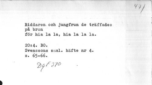 //// vy //// \>W //// t •' y''ji • VPvf * "r*' ! •' * • i*' • //// , . ; . .* . . .. • ... , 4 -•¦»... ... . t //// Riddaren.och jungfrun de träffades //// på bron , //// för hia la la, hia la la la. //// 20:4. BO. //// Svenssons saml. häfte nr 4* j //// s. 65-66. //// i ////
