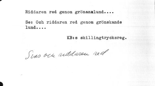 //// I //// i //// Riddaren red genom grönanxlund... //// Se: Och riddaren red genom grönskande lund... //// KB:s skillingtrycksreg. //// % //// Jlto ^c Octf^*^*- ^^ //// » //// I ////