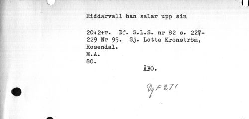 //// Hiddarvall han salar upp sin //// 20;2+r. Df. S.L.S. nr 82 s. 227-229 Nr 95. Sj. Lotta Kronström, Rosendal. M.Å. 80. //// ÅBO. ////