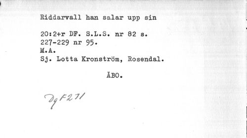 //// Riddarvall han salar upp sin //// 20:2+r DF. S.L.S. nr 82 s. //// 227-229 nr 95. M.A. //// 'i //// Sj. Lotta Kronström, Rosendal. //// 1 //// 1 //// ÅBO. //// 1 //// I //// OéW / //// I //// j ////