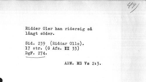 //// rr/ //// Ridder Oler han ridersig så långt söder. //// Sid. 239 (Riddar Olle). 17 str. (G Afs. II 33) //// DgF. 274. //// ARW. MS Vs 2:3. //// k ////