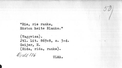 //// 7 //// "Rie, rie ranke, Hästen heite Blanke." //// (Vaggvisa). //// Jtl. Lit. 869:8, s. //// Geijer, H. //// (Rida, rida, ranke). //// ULMA. //// I ////