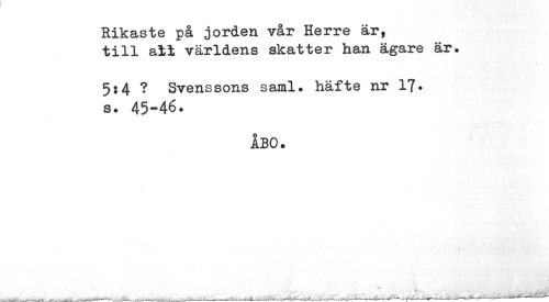 //// Rikaste på jorden vår Herre är, //// till all världens skatter han ägare är. //// 5$4 ? Svenssons saml. häfte nr 17* //// s. 45-46. //// ÅBO. ////