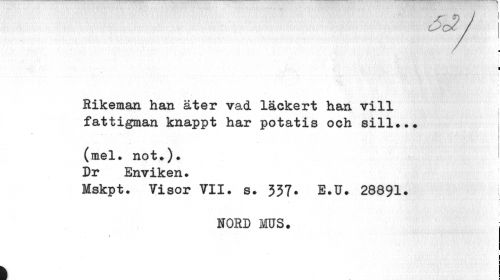 //// <5<2J | //// i //// Rikeman han äter vad läckert han vill //// i //// fattigman knappt har potatis och sill*.* //// i //// (mel. not.). Dr Enviken. //// Mskpt. Visor VII. s. 337» E.U. 28891* //// f //// NORD MUS. //// » //// i //// I //// k ! ////
