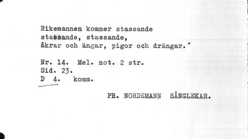 //// I //// i //// i //// Rikemannen kommer stassande stafesande, stassande, //// åkrar och ängar, pigor och drängar.' j //// i //// Nr. 14. Mel. not. 2 str. i //// Sid. 23. //// D 4* komm. ! //// PR. NORDEMANN SÅNGLEKAR. //// k ////