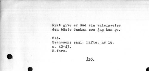 //// Rikt give er Gud sin välsigvelse den bäste önskan som jag kan ge. //// 8:4» //// Svenssons saml. häfte, nr 16. //// s. 42-43- //// H-fors. //// • c //// - * ÅBO. ////