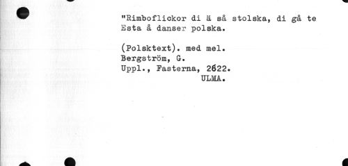 //// ^^ "Rimboflickor di ä så stolska, di gå te //// Esta å danser polska. //// (Polsktext), med mel. Bergström, G. Uppl., Fasterna, 2622. //// ULMA. ////