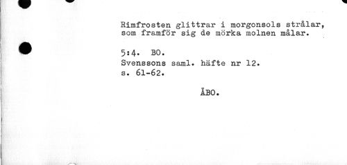 //// Rimfrosten glittrar i morgonsols strålar, som framför sig de mörka molnen målar. //// W 5:4. BO. //// Svenssons saml. häfte nr 12. s. 61-62. //// ÅBO. ////