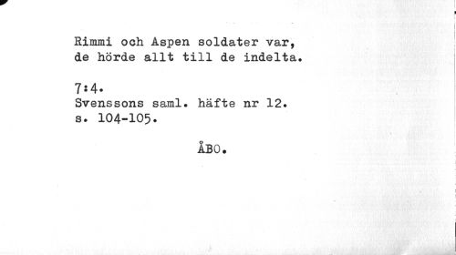 //// I //// i //// i j //// Rimmi och Asperx soldater var, de hörde allt till de indelta. //// 7*4- ! //// Svenssons saml. häfte nr 12. s. 104-105. //// i 1 //// ÅBO. //// I //// 9 //// [ ////