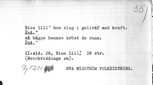//// jr "" r | //// Risa lill' hon slog i gullväf med kraft, ! //// Ahå.' //// så bägge hennes bröst de rann. //// Ahå.' I //// i //// i //// Ils sid. 28, Risa lill,' 28 str. //// (Norrkviddinge sn). f //// L //// ^ EVA WIG STRÖM FOLKDIKTNING. j //// I ////
