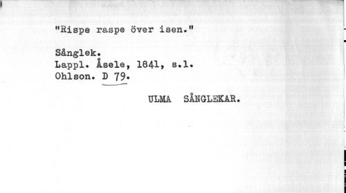 //// "fiispe raspe över isen." //// ¦ //// Sånglek» //// Lappl. isele, 1841 > s.l. //// Ohlson. D 79. //// i, > \ ^mmtmmarntm^'^^ //// i //// ULMA SÅNGLEKAR. //// I //// I //// I ////
