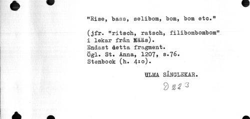 //// "Rise, bass, selibom, bom, bom etc.rt //// (jfr. "ritsch, ratsch, filibombombom11. //// i lekar från Hääs). //// Endast detta fragment. //// Ögl. St. Anna, 1207, s.76. //// Stenbock (h. 4Jo). //// ELMA SÅNGLEKAR. ////