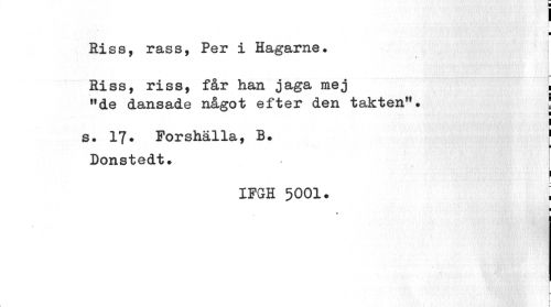 //// ! ¦ //// Riss, rass, Per i Hagarne. //// % //// Riss, riss, får han jaga mej , //// "de dansade något efter den takten". I //// s. 17. Forshälla, B. j //// i //// Donstedt. //// I //// I //// IFGH 5001. | //// ¦ //// r ////