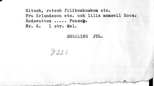//// »i //// i //// Kitsch, ratsch filibombomhom etc. //// Fru Erlandsson etc. och lilla mamsell Roos» //// 4 v # //// Sodavatten ... Punscfe. //// Nr. 6. 1 str. Mel. //// EGG3LING JUL. //// JL ////