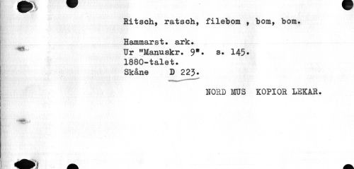 //// Ritsch, ratsch, filebom , bom, bom. Hammarst. ark. //// Ur 11 Manu skr . 3*. s. 145 • //// 1880-talet. Skåne D 223. //// NORD MUS KOPIOR LEKAR. ////