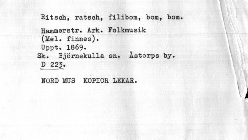 //// i //// Ritsch, ratsch, filibom, bom, bom. //// \ //// Hammarstr. Ark» Folkmusik //// (Mel» finnes)» \ //// Uppt. 1869. Sk» Björnekulla sn. Åstorps by. //// D 225. ' É| //// NORD MUS KOPIOR LEKAR. //// * * >V v ////