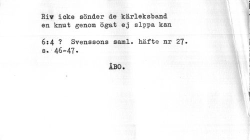 //// W ;i //// Riv icke sönder de kärleksband en knut genom ögat ej slppa kan //// ...|| I //// 6:4 ? Svenssons saml. häfte nr 27* i //// s*•46-47* | j //// ABO. //// ': 1 I //// I ////