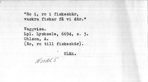 //// nRo i, ro i fiskeskär, vackra fiskar få vi där." //// Taggvisa. //// Lpl. Lycksele, 6694> s. 5. I //// Ohlson, A. //// (Ro, ro till fiskeskär). //// ULMA . ////