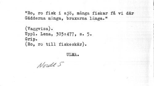 //// \ //// "Ro, ro fisk i sjö, många fiskar få vi där I //// Gädderna mänga, braxarna länga." //// i i //// (Vaggvisa)• //// Uppl. Lena, 303:477* s. % //// Grip. //// (Ro, ro till fiskeskär). //// ULMÅ. ////